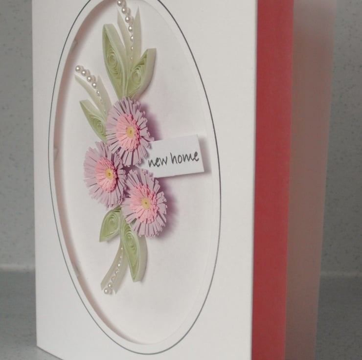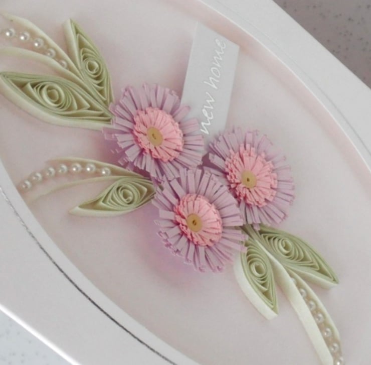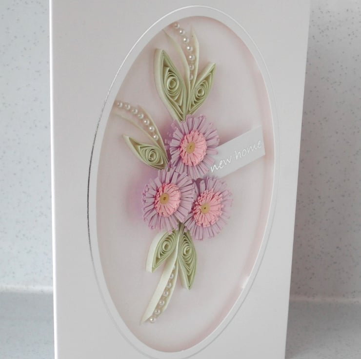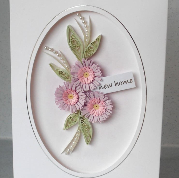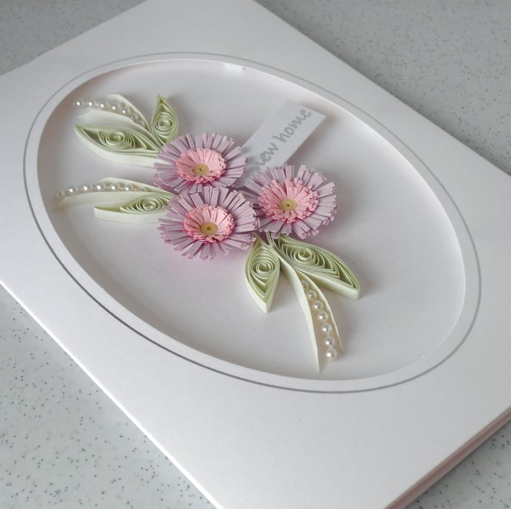A beautiful quilled card with quilling flowers in coordinating shades, perfect for sending new home wishes.
