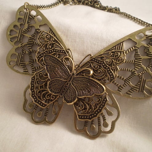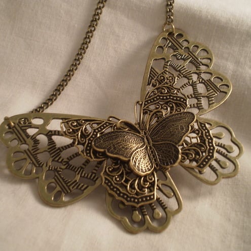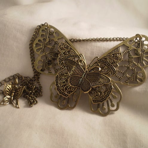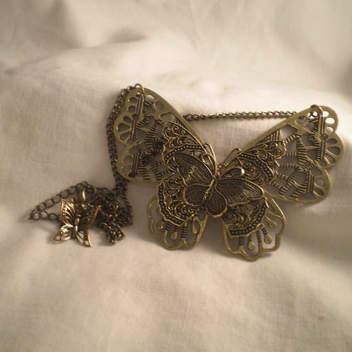 All butterflies have an antiqued gold tone finish and it hangs from an 16 inch chain with a 3 inch extender, complete with a cute butterfly charm.