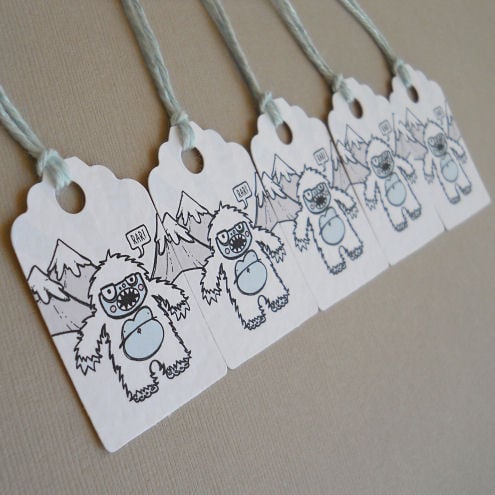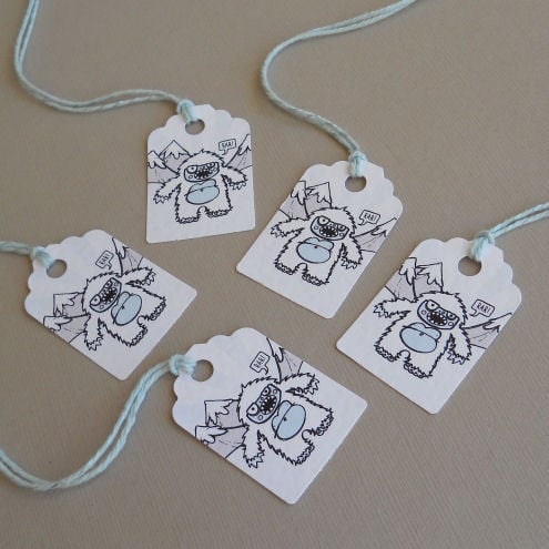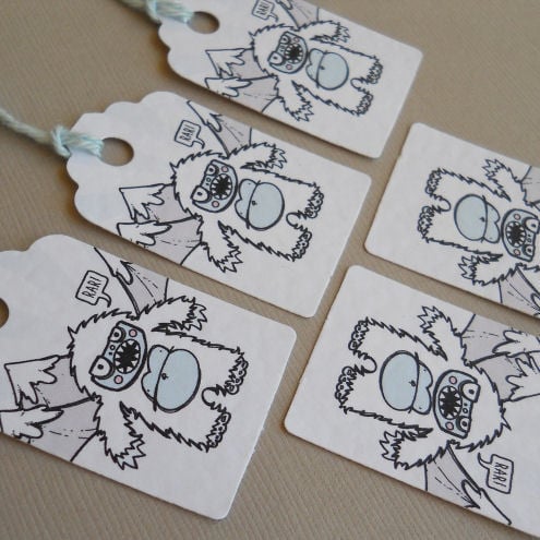 a pack of 5 tags, featuring my illustration of a little yeti saying "rar!" . cute and quirky, and great to use for decorating, labelling or as gift tags.