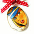 adorable pigtailed blonde girl skipping with flowers in her hands. Picture has been encased in crystal clear resin and complimented with a daisy charms and a lucite yellow flower charm.