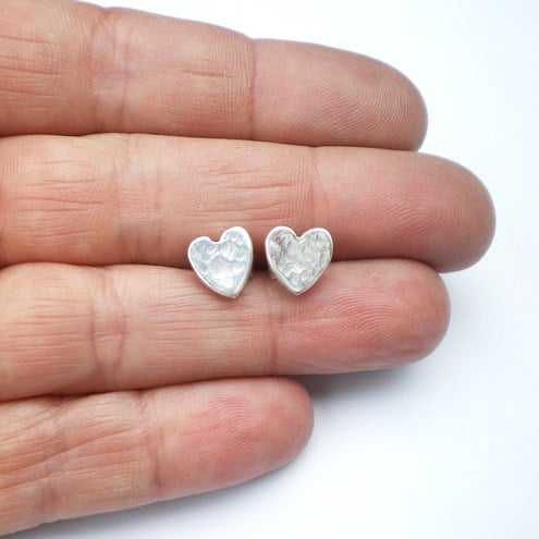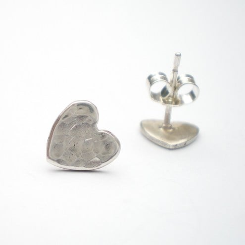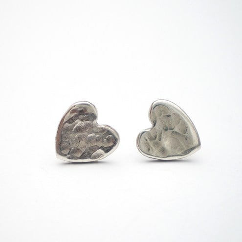 Pretty heart shaped silver stud earrings with a hammered texture which sparkles in the light.