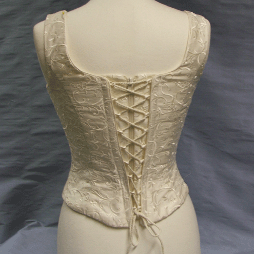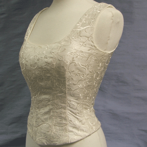 Beautiful sleevless fully boned and lined corset, a classic design with panelled fronts and back to give a lovely fitted shape, laced at back over zip for added strength, fabric is embroidered pure silk in a ribbon and bow design,A lovely design and deserves to be worn.