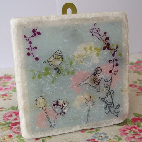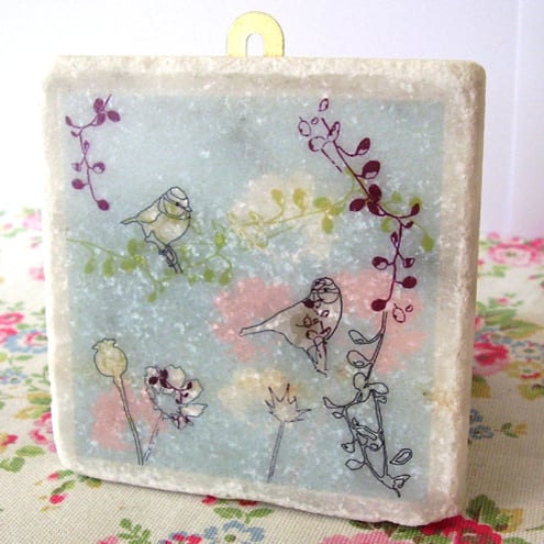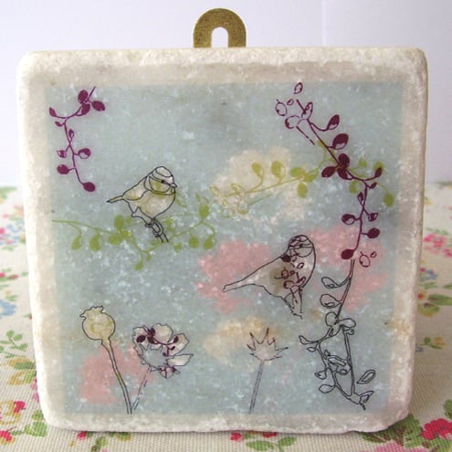 white marble tile featuring an original 'littlebirdy' design to hang on your wall!
