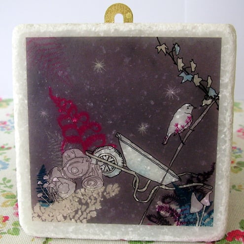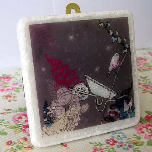 the design is printed onto a special decal paper which i have then carefully applied to a natural stone, white marble tile. I have then glued a small brass mirror plate to the back so you easily hang the tile on the wall (nail not supplied)
