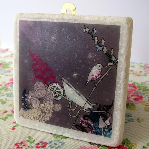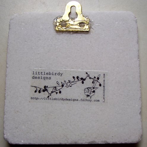 white marble tile featuring an original 'littlebirdy' design to hang on your wall!