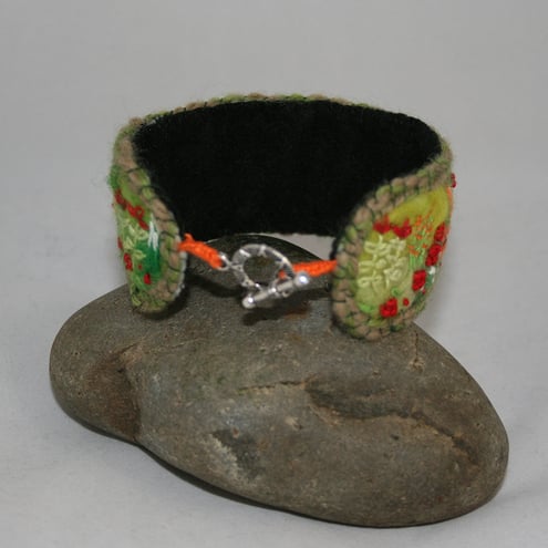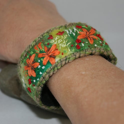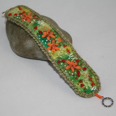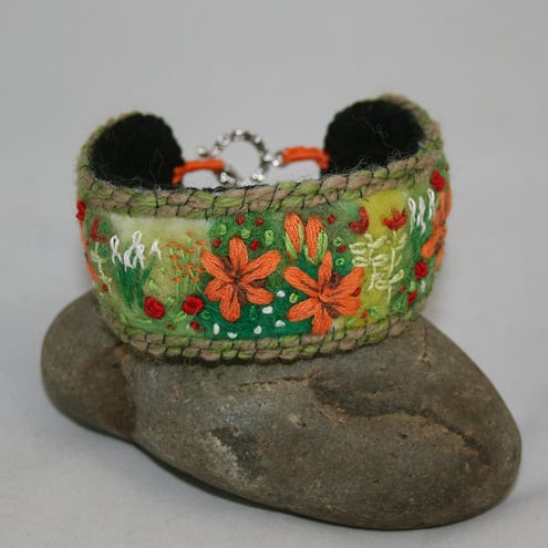 The background of this bracelet has been needle felted using hand-dyed fibres, including merino and silk. The lillies in the foreground are stitched in a knitting ribbon. The roses, lillies, irises etc in the border are stitched in embroidery threads using a combination of simple stitches. The design is framed by two rows of couching over green yarns. The materials used, are the same as those in the lily pendant, brooch and ring. The design is an adaptation of the brooch stitching. Whilst you may not choose to wear all the items at the same time, two or three of them would make a lovely gift set!