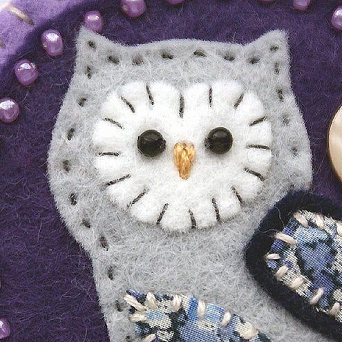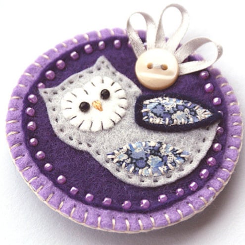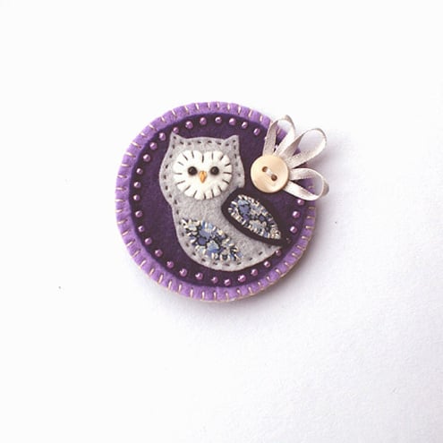 It features a little owl with appliqued wing and belly in pretty Liberty print fabric. It is mounted onto a purple circular felt base which is edged with pretty coordinating seed beads. It is further mounted onto a lilac backing and is finished with a button and ribbon detail. It has a brooch backing for easy attachment.