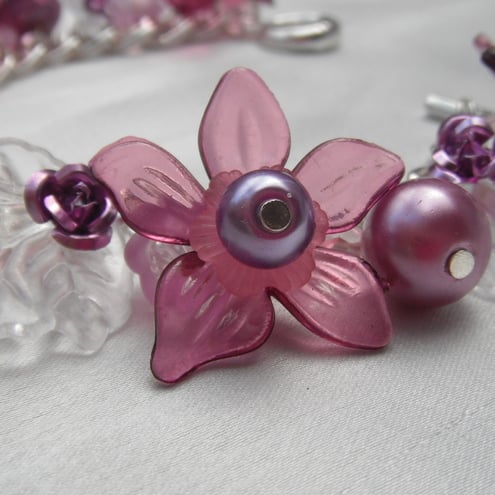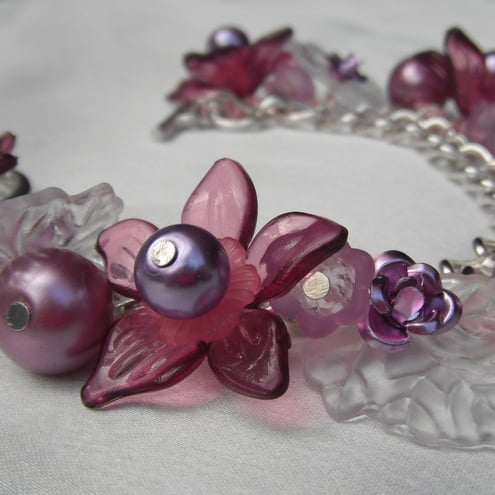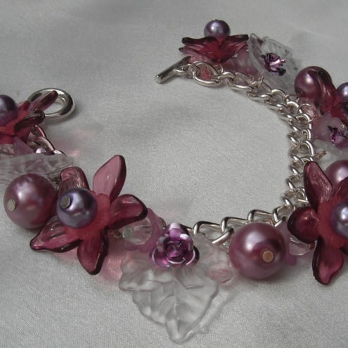 This lovely chunky curb chain charm bracelet, reminds me of one of my most favourite flowers in my garden, the fuchsia. Made with beautiful plum and pink and lilac lucite flowers and clear leaves, embellished with lavender aluminium rose beads. Interspersed are 12mm Czech glass pearls and faceted beads, in delicious pinks and lilacs. Finished with a matching chunky toggle clasp.