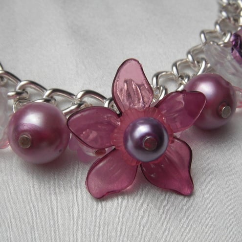 Silver plated charm bracelet, adorned with beautiful lucite flowers and Czech glass pearls and bicone crystals.