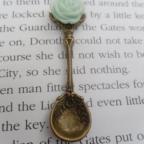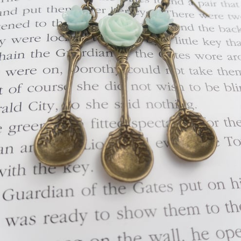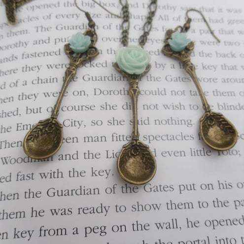 This is a lovely antique bronze spoon set. A lovely necklace plus matching earrings they have a lovely mint green rose attached to the spoons with a fab bronze toggle easy fastener The necklace is 20inch spoons are 5.5 cm.