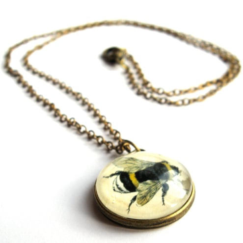 This is a gorgeous necklace featuring an image of a bee taken from a Victorian scrap.