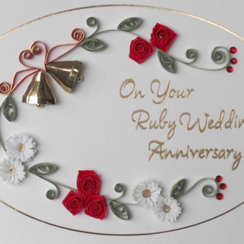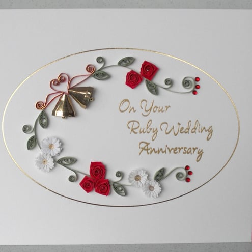A beautiful handmade quilled 40th ruby anniversary card with quilling roses, daisies and bells. Perfect for helping a special couple celebrate a milestone anniversary.
