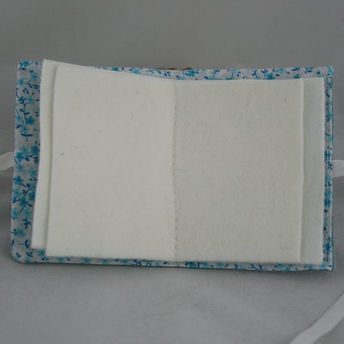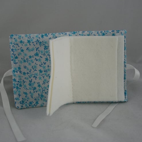 The cover of this needle book has been stitched from blue, linen effect fabric, backed with iron-on interfacing, and lined with a cotton fabric in a small floral print. The 'pages' of the needle book are formed of two pieces of white felt - giving a total of four 'pages'. The needle book closes with a ribbon bow.