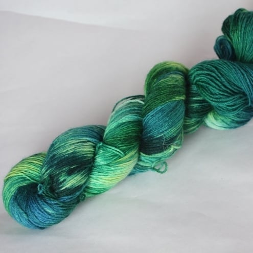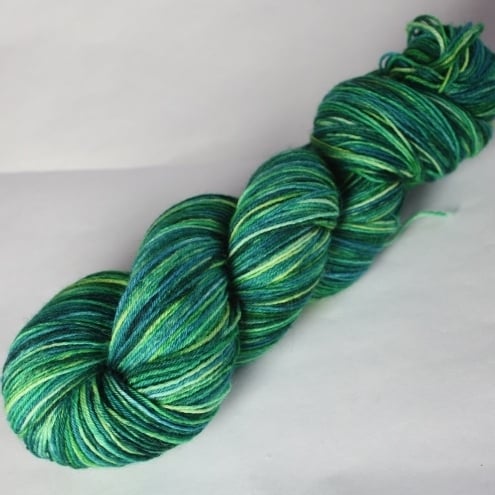 A lively blend of yellow, lime, emerald, teal and dark forest green. This superwash yarn has a slightly