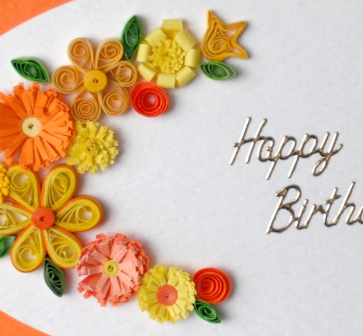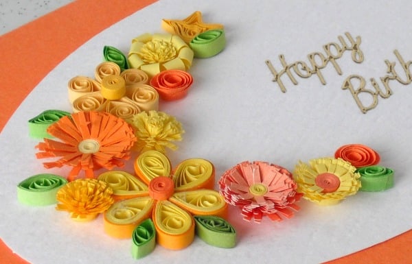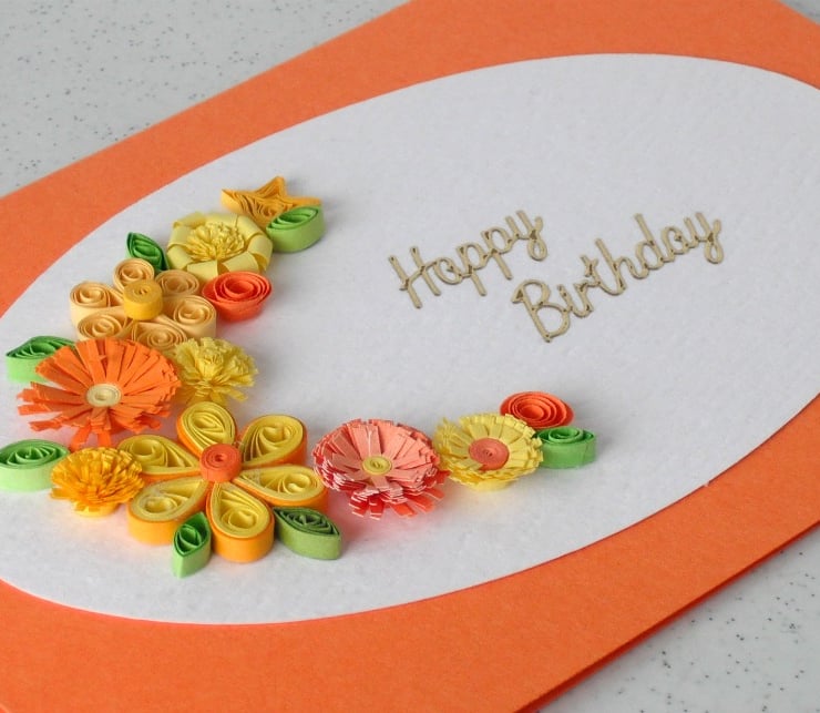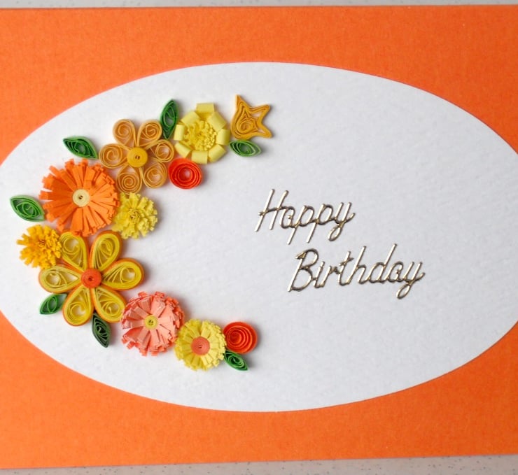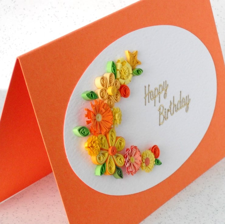 A beautiful quilled card with quilling flowers in coordinating colours, perfect for sending birthday wishes to friend or family.