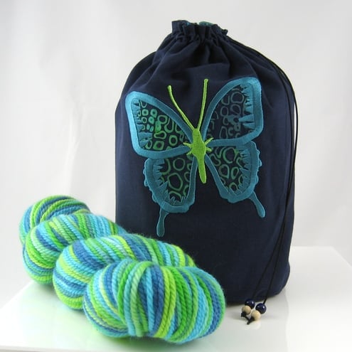 The fourth picture shows the bag alongside a 100g skein of sock yarn for scale purposes only. Please note that this listing is just for the bag and pouch.