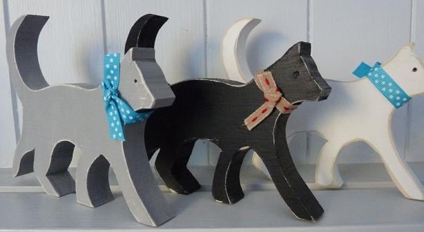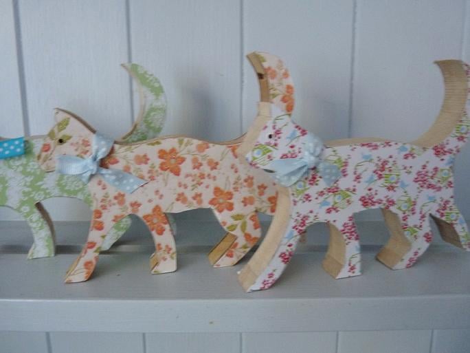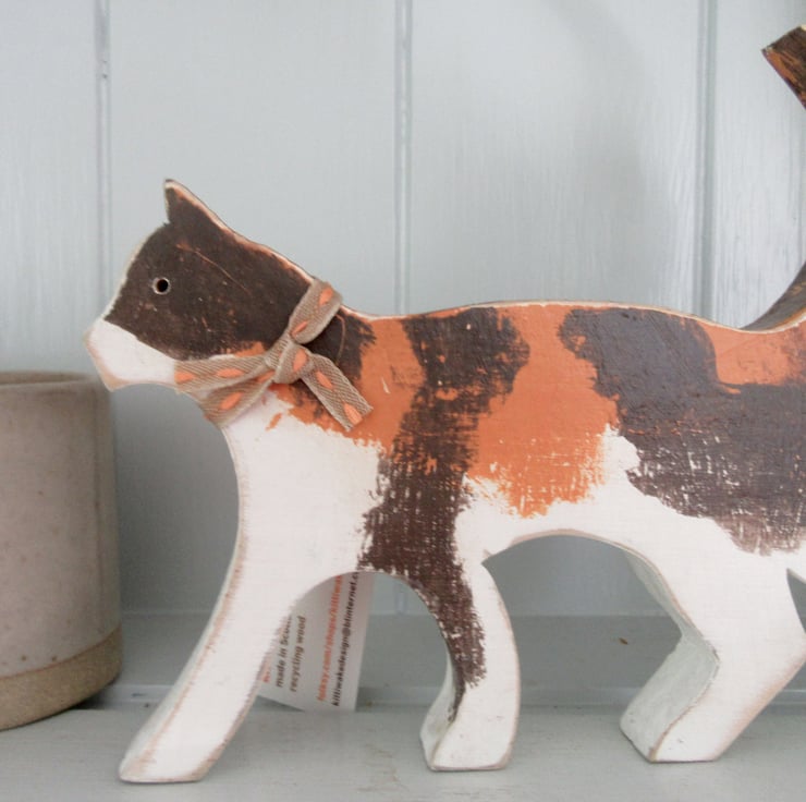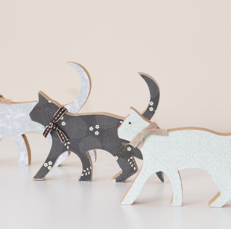 These cats are made using reclaimed and recycled wood. Each cat is made by hand and cut out using our band saw. Cats come in various colours or are decorated with patterned paper. Please specify which you would like when ordering.