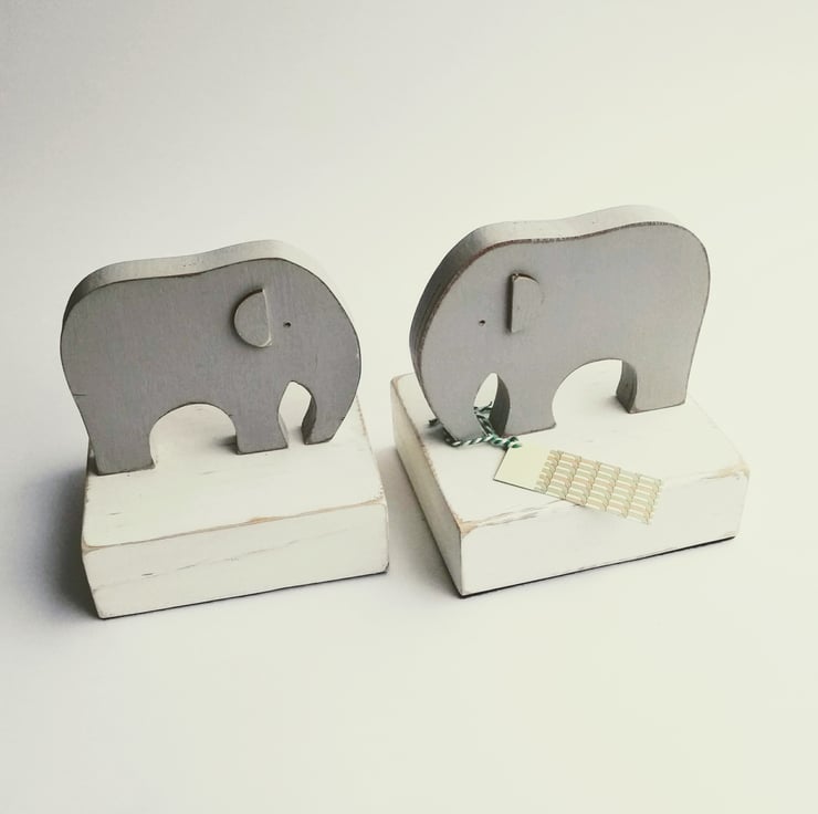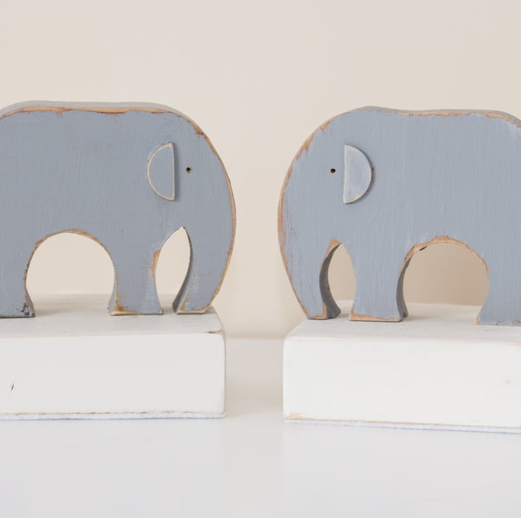 Handmade using recycled salvaged wood. Elephants cut out using a bandsaw and sanded and painted then made into these lovely bookends. I can't guarantee that the bookends will be exact to the listing showing. Each bookend is unique due to the very nature of the reclaimed materials we use.