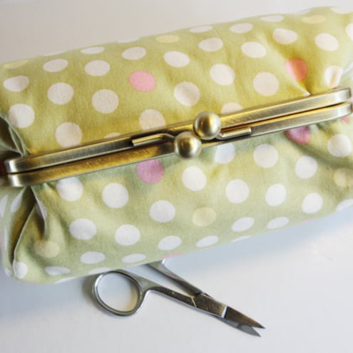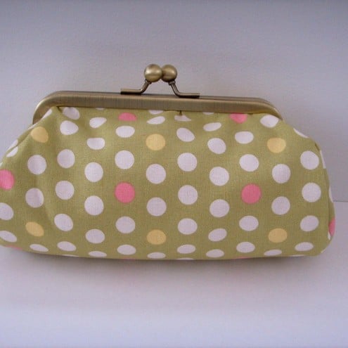 Perfect little clutch for your mobile phone, keys, sunglasses,change and credit cards or even a make-up bag. Pretty green spotty fabric with contrasting lining, padding and metal frame clasp.