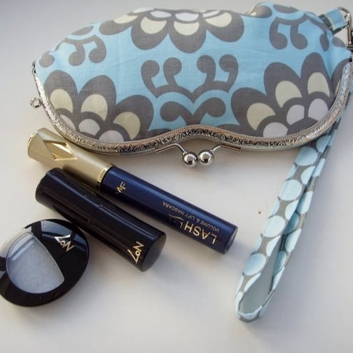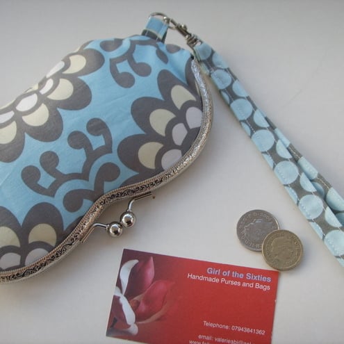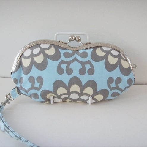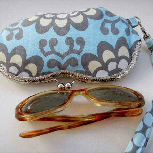 Charming little wristlet purse for sunglasses or mobile phone in pretty Amy Butler fabric with contrasting lining and removable wrist strap. Measures approx 7"x3.5"