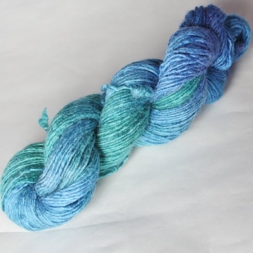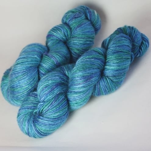In shades of blue and green with glimpses of purple, this distinctive DK weight yarn has a silky sheen and characteristic halo. This yarrn has been corespun (spun round a central core) to give the appearance of a single ply roving yarn. This yarn will make wonderful, snuggly soft winter hats, scarves, shawls... This yarn has been reskeined as shown in the first two photographs but is shown before reskeining in the third photograph for reference only. There are two skeins available (price shown is for one). These skeins are very similar but one has slightly more purple, so if you siwh to use them in the same project, alternating skeins as you work is advisable.