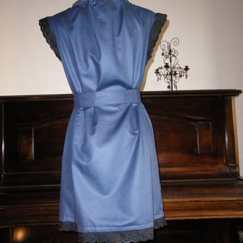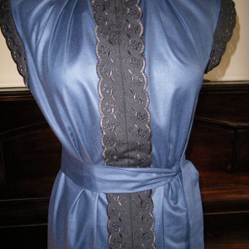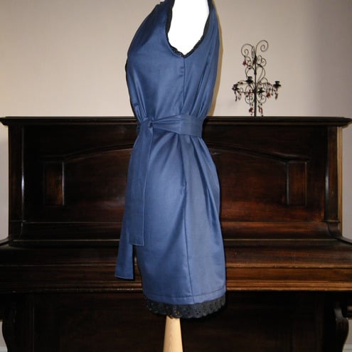 This Navy Gabardine dress has a lovely sheen to the fabric.It,s simple clean lines are complimented prettily with an unexpected Black Broderie-Anglais, pretty, practical and feminine this dress has it all.Wear it plain for the office or go to town with added Bling,literally! Two, vertical, central lace-panels,capped sleeves and lace-trimmed hem with a self-tie waist in Navy.....what more could you ask for?......xx