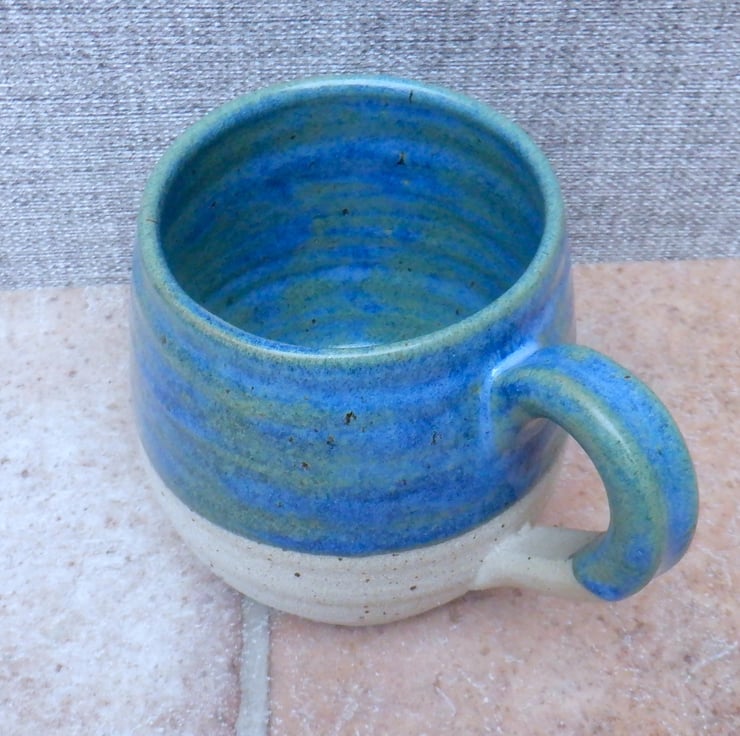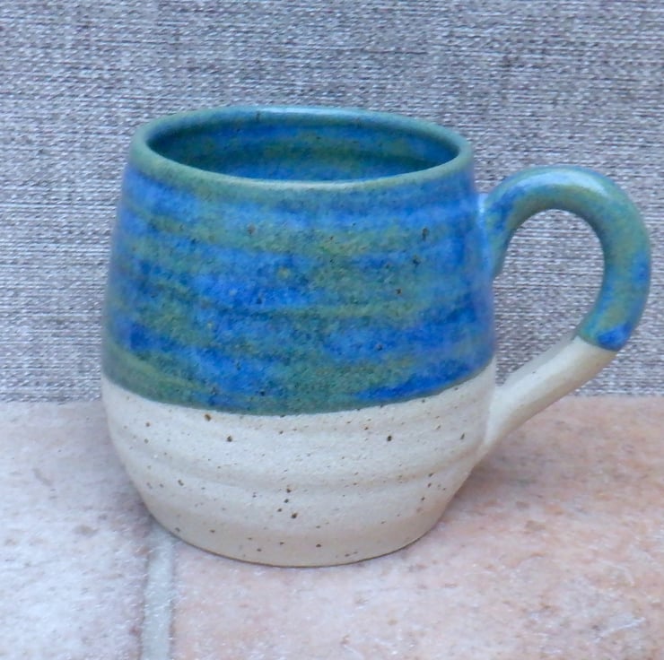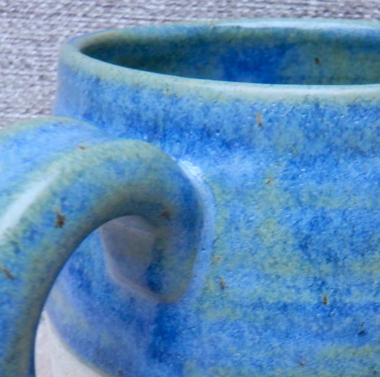 I threw this very large cuddle mug on my pottery wheel using strong off-white stoneware clay, with a distinct speckle, and finished in a pretty mix of sky blue and green reactive glazes.