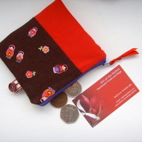 Cute little coin purse with contrasting zip, ribbon and lining. Perfect for your coins, credit cards and all the little things hanging around in the bottom of your handbag.