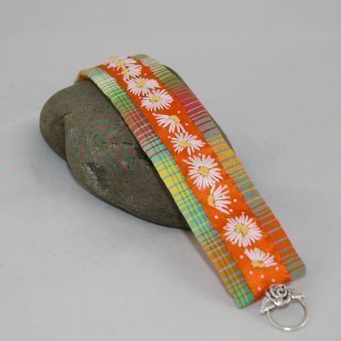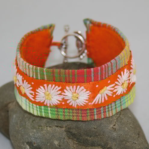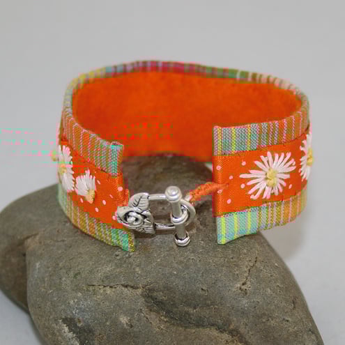 The background of this bracelet is a bright, cotton fabric in citrous colours. The ribbon chosen for the embroidered panel, is a white spot on bright orange design. Daisies are hand embroidered onto the ribbon in white and bright yellow to coordinate with the background fabric.