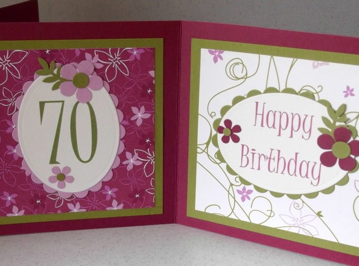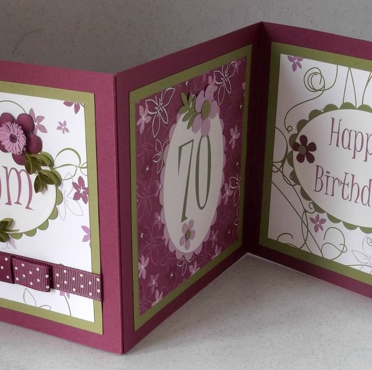 Each panel of the card measures 5" x 5" approx. The front panel is decorated with quilling flowers and foliage, the other panels are adorned with punched flowers, all in pretty shades of plum, lilac and olive green. Each panel can be personalised to your specifications - just send me a note to say what you would like. The card could be to congratulate someone special on a memorable birthday, or personalised for any other special occasion.