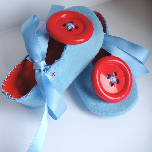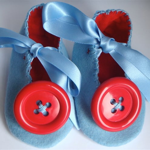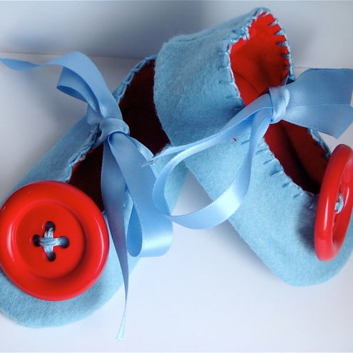 These are so cute, made from felt they have baby blue uppers and soles, and are lined in red, they are decorated with 1 very large red clown button on each shoe, with pale blue ribbon ties, the pattern for these shoes are for 3-6 mths, but they may fit an older baby, 11cm length and 5cm wide, inside measurements.