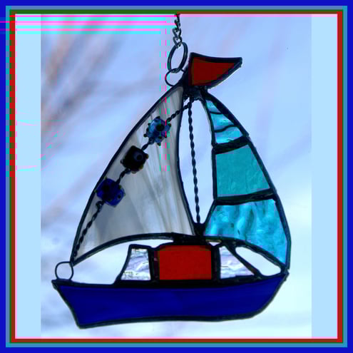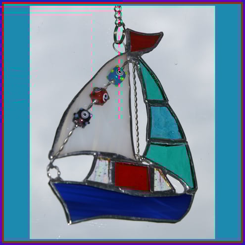 It has a streaky bright turquoise-blue hull, a red cabin with clear textured iridescent glass windows, a bright turquoise sail which includes some very sparkly iridescent glass and a streaky white sail which is decorated with 3 square beads in bright colours to match the boat.