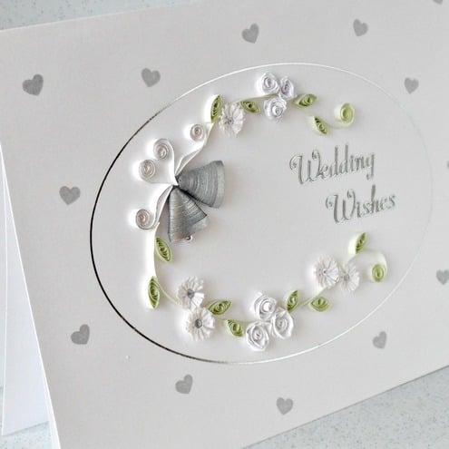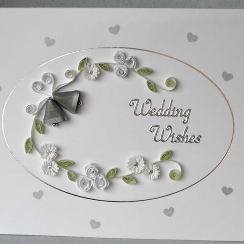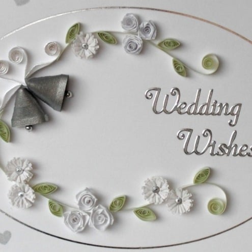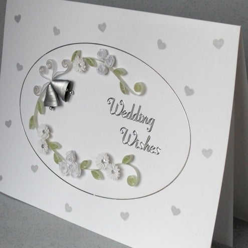 Quilled bells with quilling daisies and roses make this card perfect for celebrating the special day.
