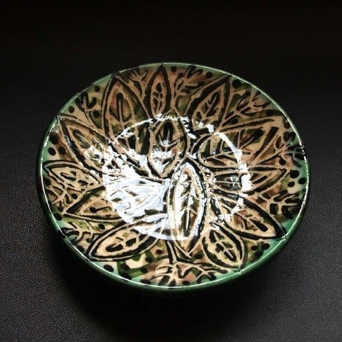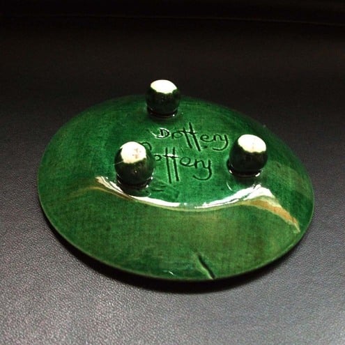 This tiny little plate is the perfect size for an individual cupcake or muffin, trinkets or a nice smelly candle - it is a leafy design, with a glossy green back and matching feet!