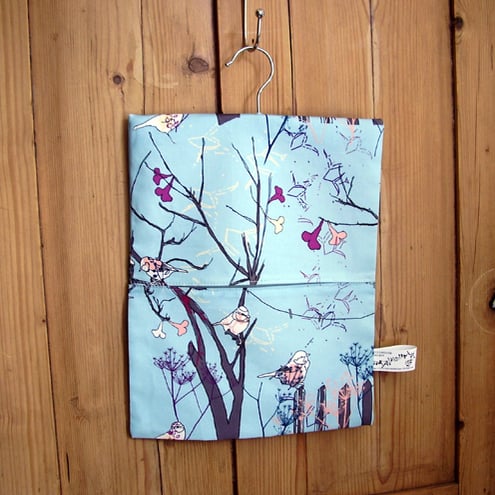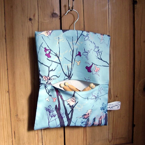 My original littlebirdy design has been digitally printed onto high quality linen-cotton canvas and then machine and hand sewn by me into a peg bag hung on a wooden painted matching hanger.