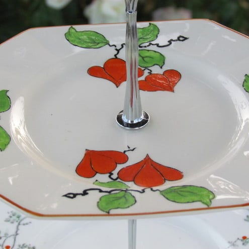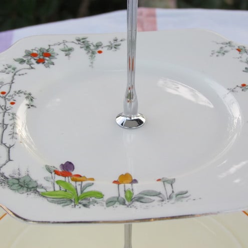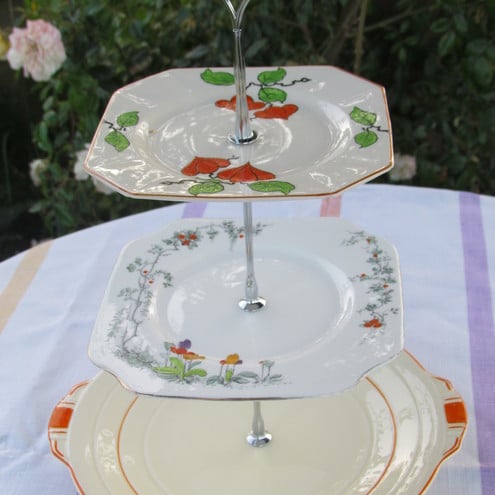 Made of old or vintage plates, this one features a plates featuring orange flowers and black detail. The top two plates are square and the base plate is an oval platter with two handles.
