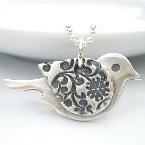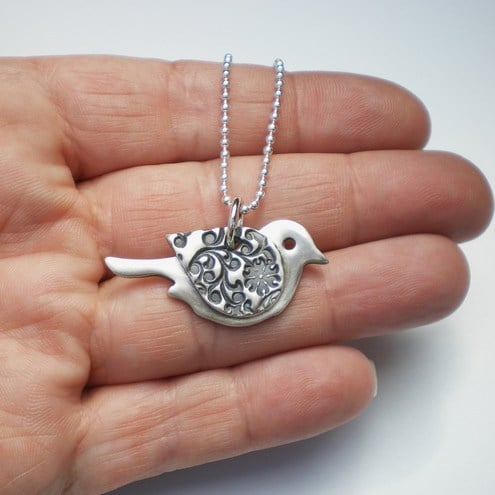 Cute silver bird pendant with an orange blossom texture wing. Inspired by nature and made from recycled silver he makes a great eco friendly choice!