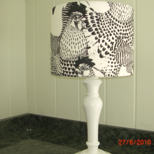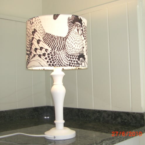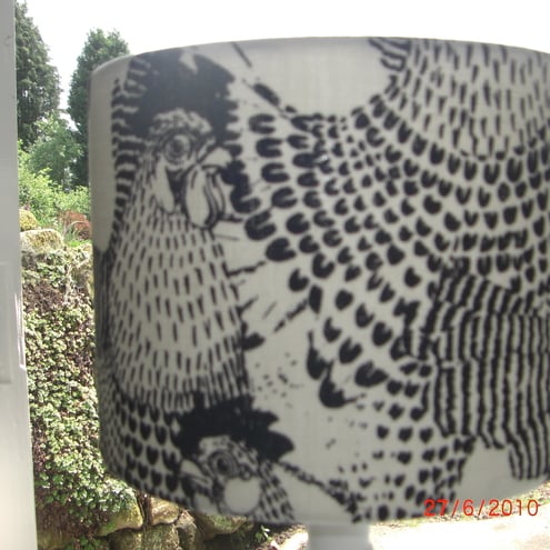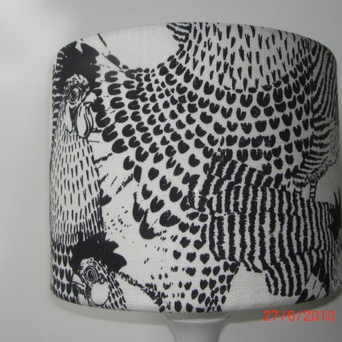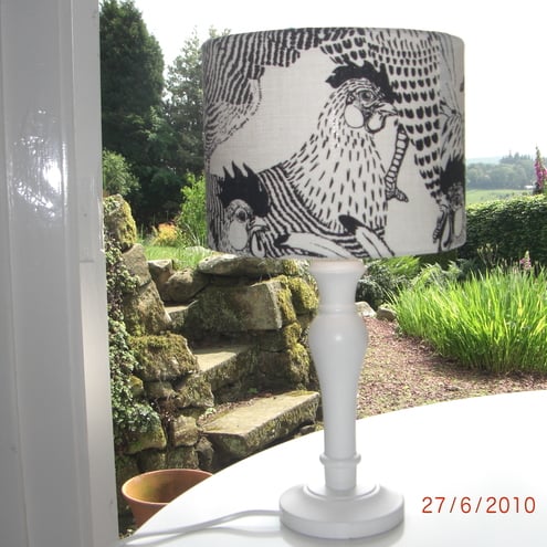Drum table lampshade covered in Mulberry Cockerels linen.