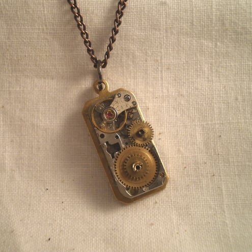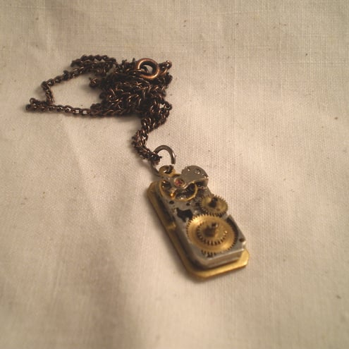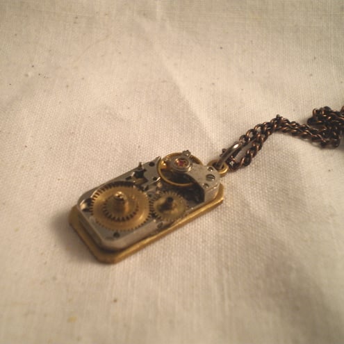 A vintage oblong watch movement has been mounted onto a raw brass base and has had extra cogs added to give full effect to the intricate workings.