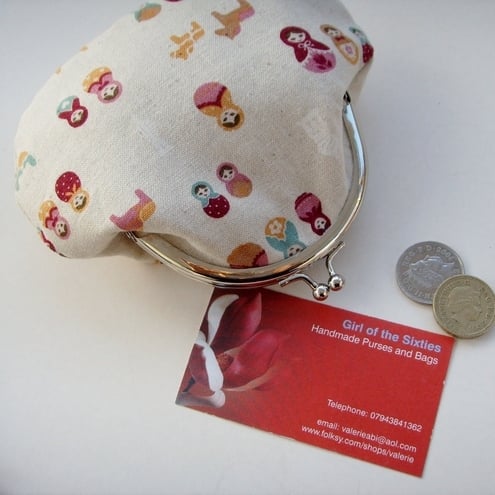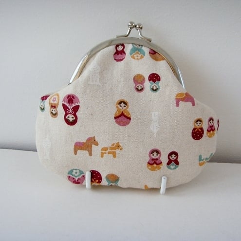 Perfect little purse for your keys, change and credit cards.Little Russian dolls fabric with contrasting lining, padding and metal frame clasp.