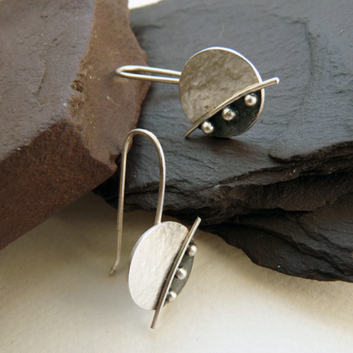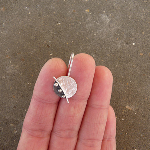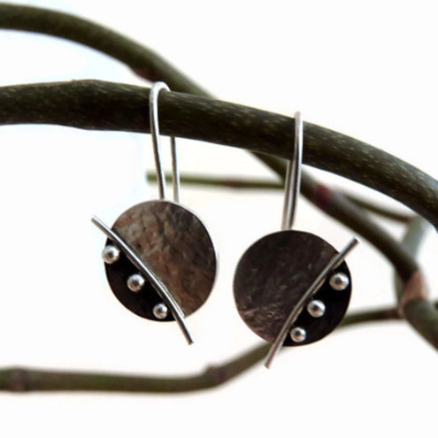 These contemporary disc earrings are completely hand made in sterling silver. They have been textured, partially oxidized and polished to a satin finish. They have handcrafted sterling silver earrings hooks soldered to them.