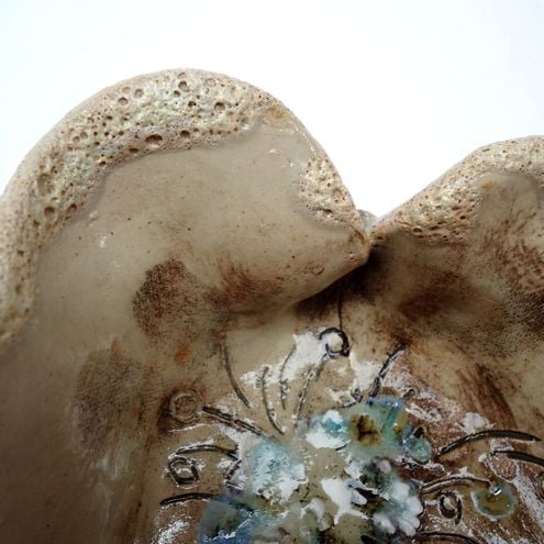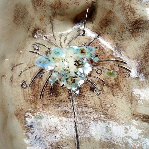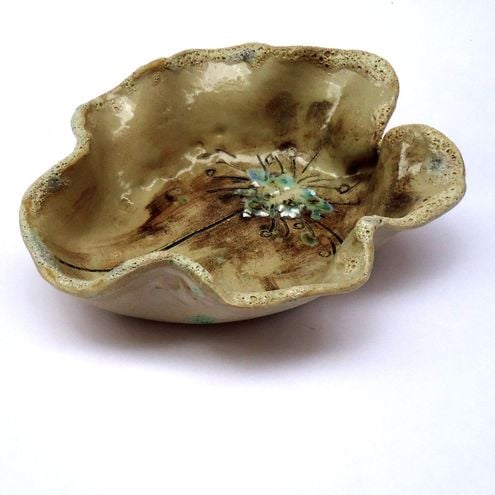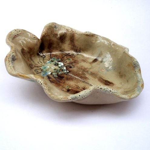 This decorative ceramic bowl was handmade by me in my workshop and is a unique one-off piece. Featuring one of my new dandelion designs, this bowl measures approx 20cm long and has a textured glaze applied around the outer wavy rim. Glazed with a shiny smooth finish, perfect for a soap dish or to admire on it's own in the middle of a coffee table.