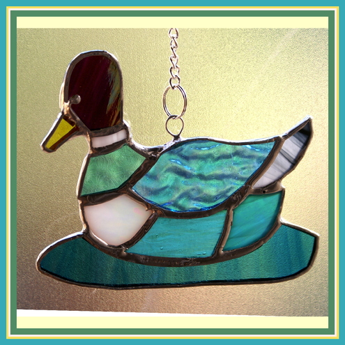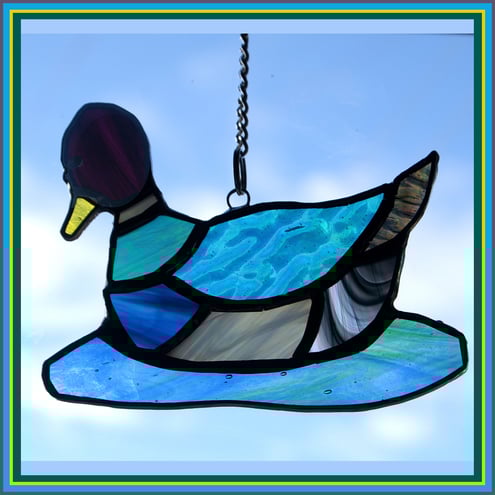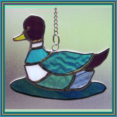 The duck is sitting on a pool of streaky aquamarine water and looks absolutely gorgeous hanging in the window and catching the light which makes it lovely colours shimmer.