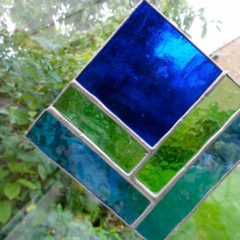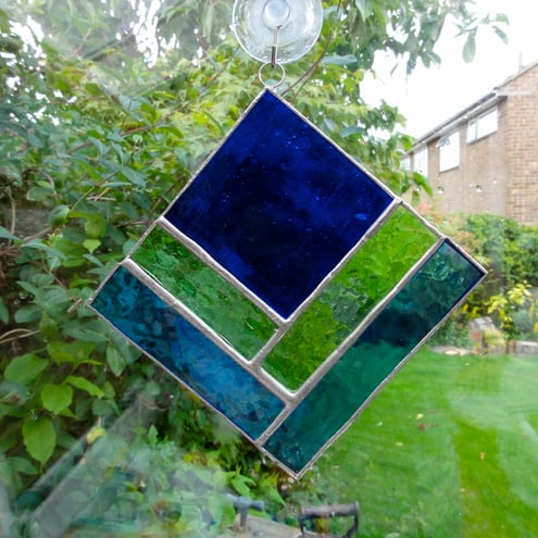 Here is a simple suncatcher made out of soft blue and green coloured stained glass; pale blues and green.Each piece of glass has been copper foiled and soldered together, a ring has been attached for hanging purposes.If you would like this made in a different colour just drop me an email and i am sure I will be able to make what you want.
