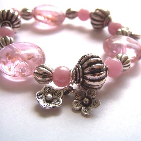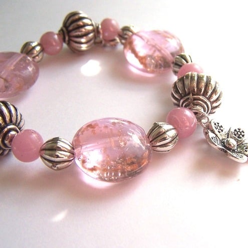 These lovely pink beads are the colour of marshmallow! They have been combined with chunky silver tone lantern beads and little silver flower charms to create a pretty summery bracelet.