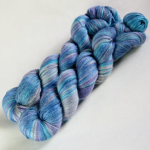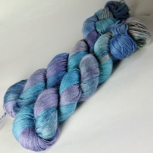 Shades of azure, lilac, silvery-grey, denim and sky blue. This gorgeous and luxurious yarn has the softness and warmth of alpaca with the smooth sheen and cool feel of silk. It should make beautiful lace projects. It is reskeined as shown in the first two photographs but is shown before reskeining in the third photograph for reference only. There is one skein left.