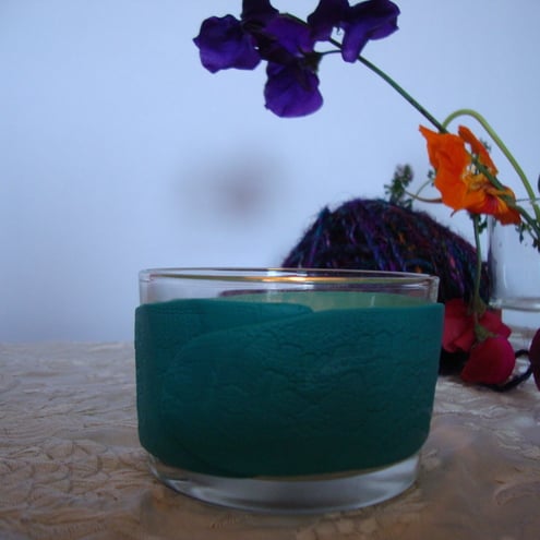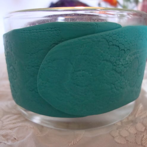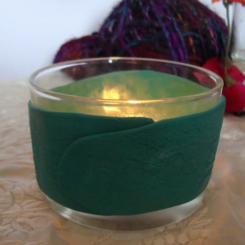 Glass candle holder decoarated with custom mixed turquoise fimo impressed with lace. I mixed different fimo colours to make this pretty turquoise colour and patterned it with lace before wrapping it around the glass tea-light holder to make a lovely decoartive candle holder.