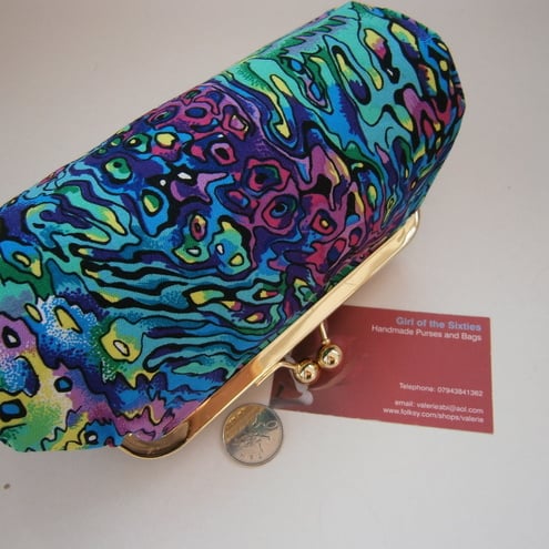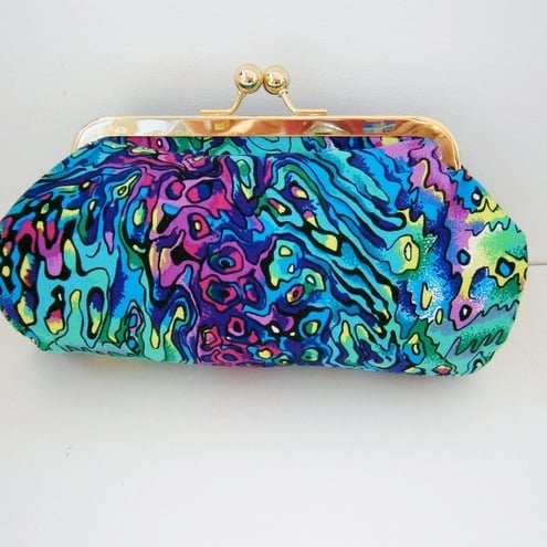 Perfect little clutch for your mobile phone, keys, sunglasses,change and credit cards or even a make-up bag. Pretty Pacific Paua shell fabric from New Zealand with contrasting lining, padding and metal frame clasp.