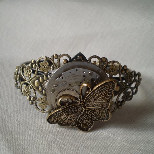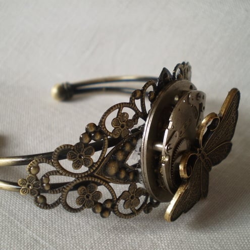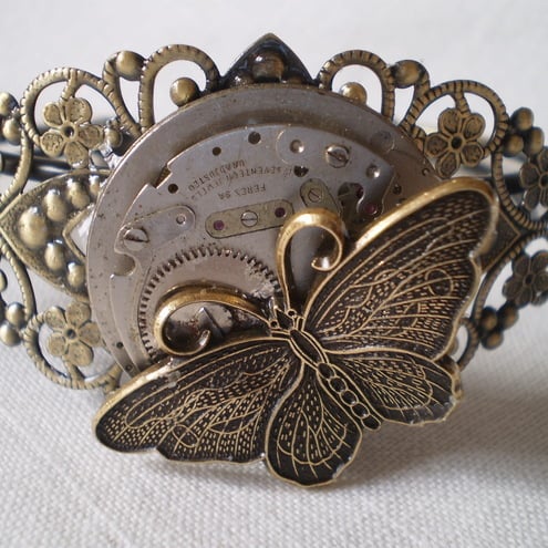 A gorgeous Steampunk bracelet/cuff has been created from an antiqued filigree base..... a lovely Vintage watch movement has been added...
