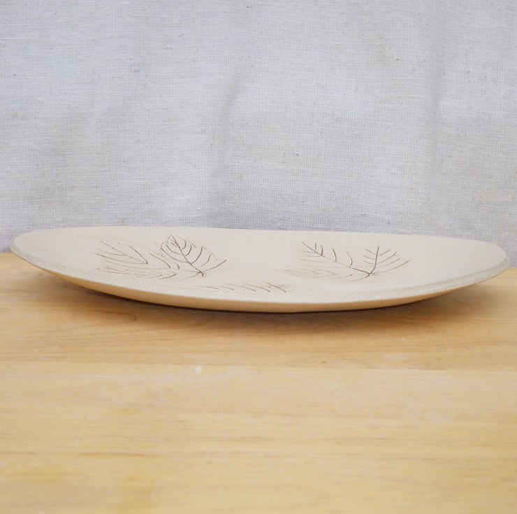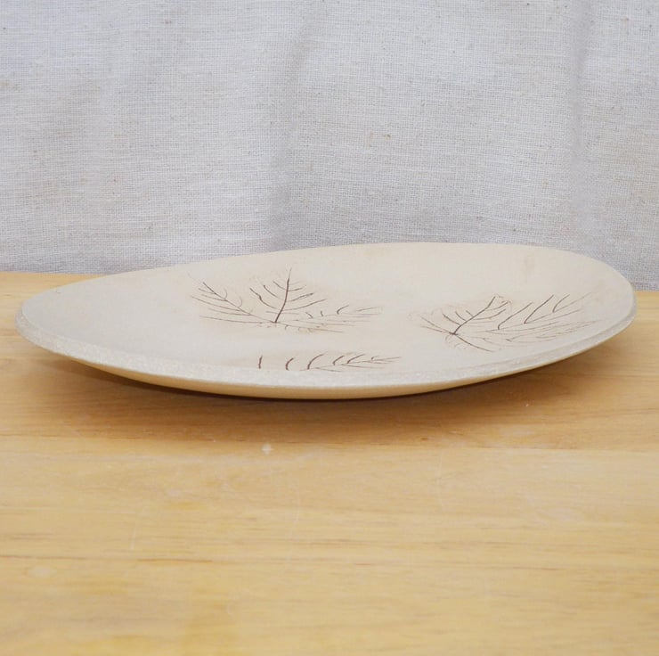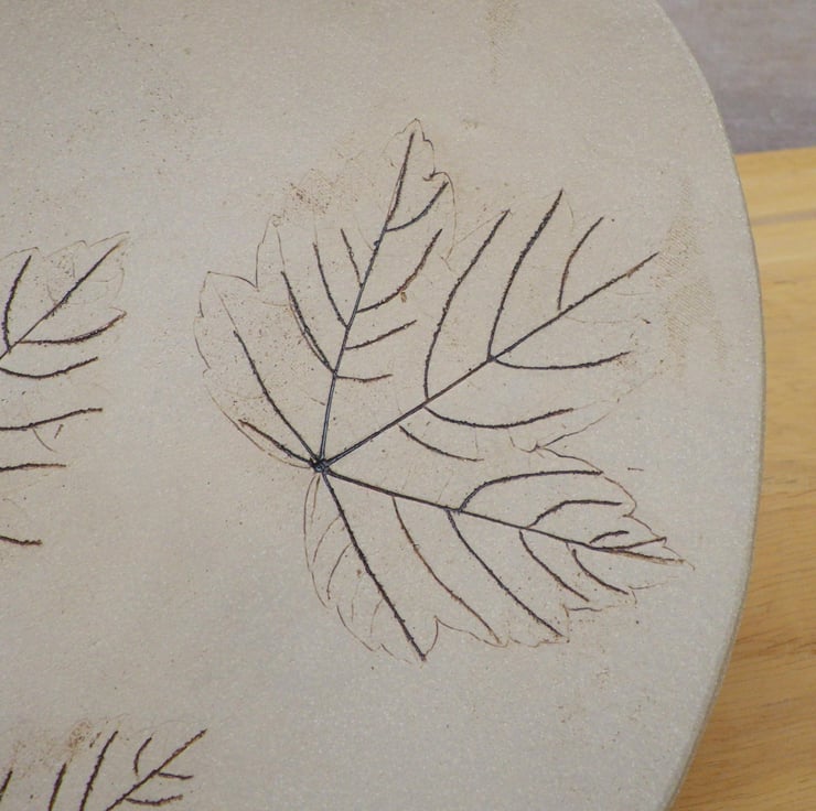This oval dish was made with a rolled out piece of strong white stoneware clay which I have pressed some actual sycamore leaves into.